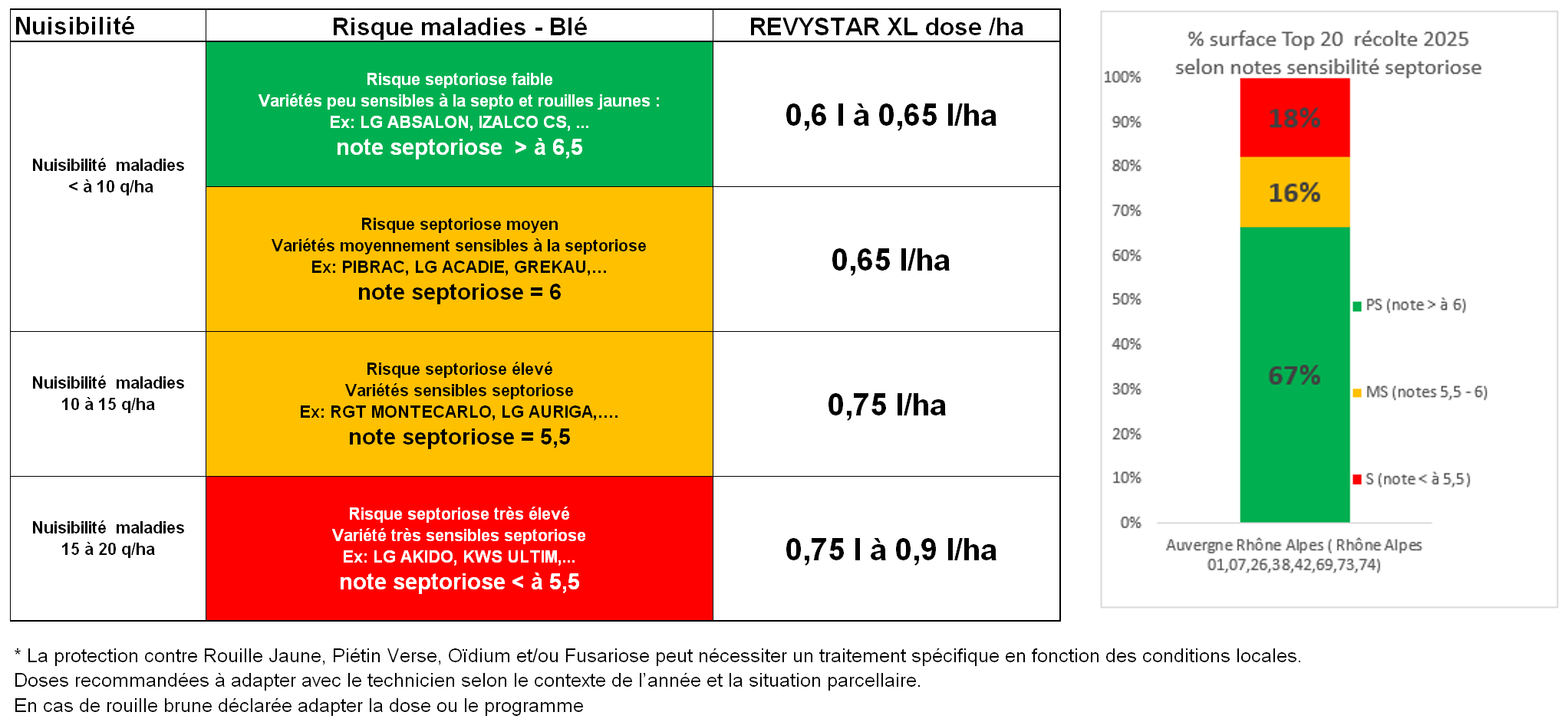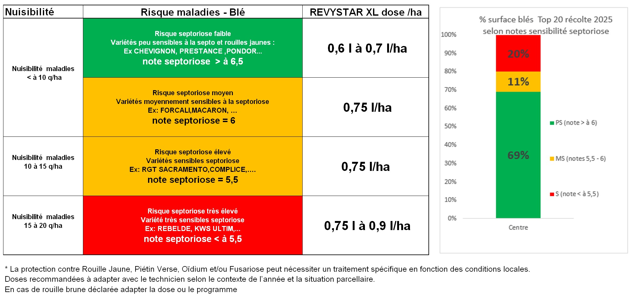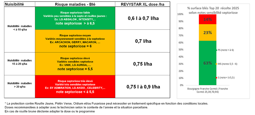 La protection contre rouille jaune, piétin verse et/ou oïdium peut nécessiter un traitement spécifique en fonction des conditions locales.