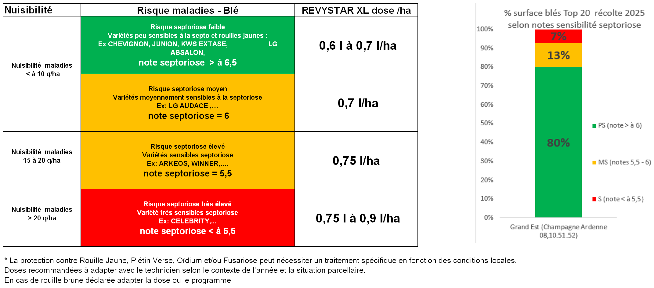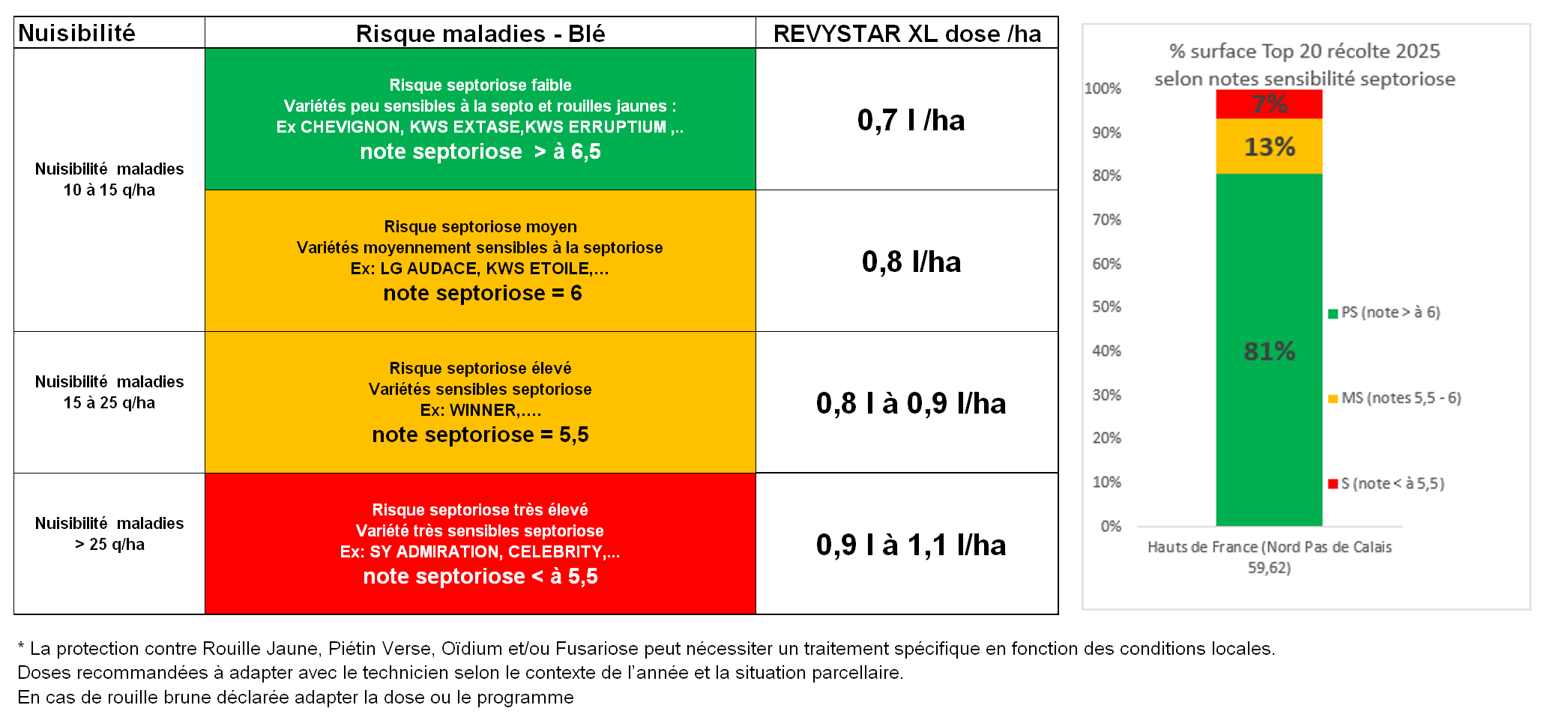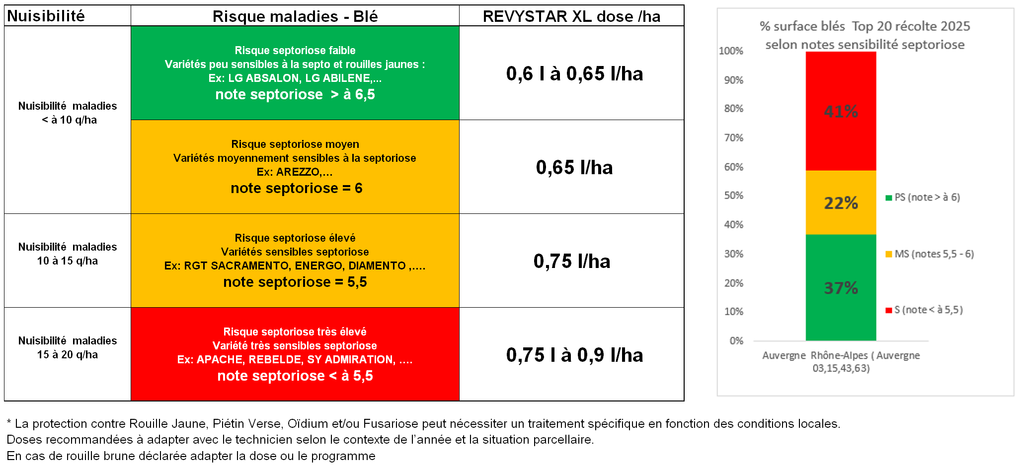 La protection contre rouille jaune, piétin verse et/ou oïdium peut nécessiter un traitement spécifique en fonction des conditions locales.